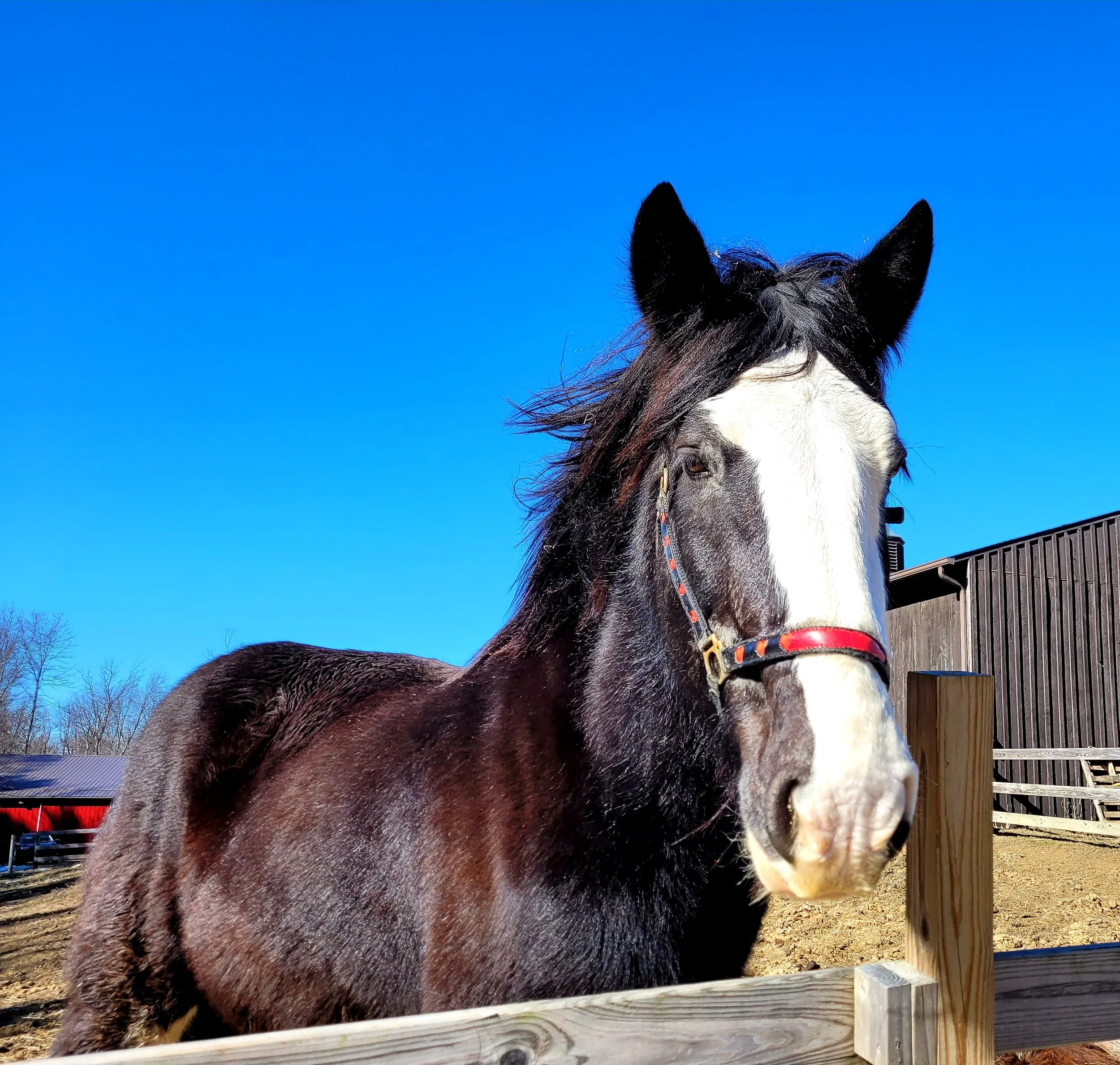 Milly is a gentle giant Shire horse who enjoys spending her pasture time with best friends Shirley and Icelandic horse, Geyfa. Millie and Geyfa were both very timid when they first arrived here in June of 2020, but now Millie is confident and one of the first animals to say ‘hello’ to volunteers.